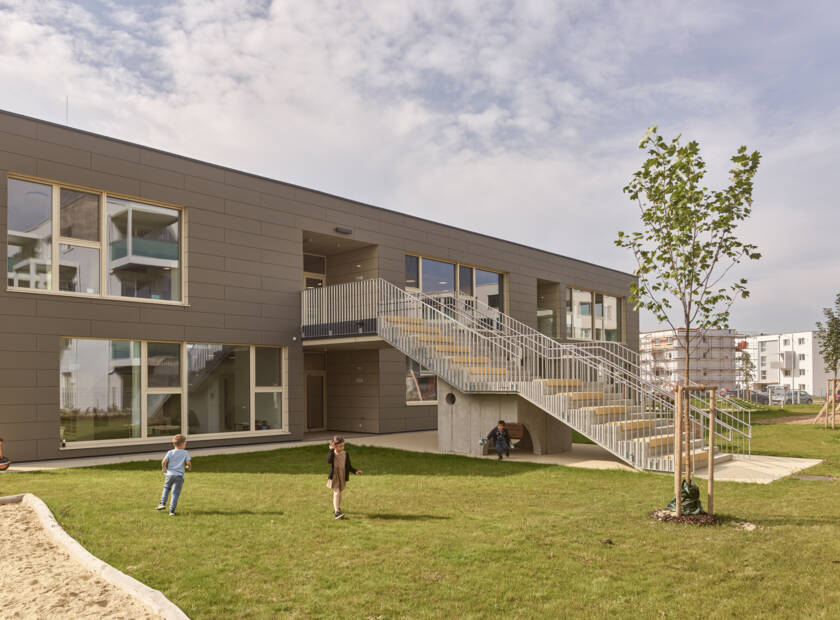 Für die Außenfassade der Kinderbetreuungseinrichtung war eine feine, gewebeartige Oberflächenstruktur gewünscht, die mit den großformatigen Fassadenplatten Texial von Swisspearl perfekt realisiert werden konnte. Die seidig schimmernde Oberfläche und die haptischen Qualitäten dieser Fassadenplatten sind einzigartig, sie geben dem Gebäude seine eigene, kindgerechte Außenhülle. Der diffuse Glanz lässt das Gebäude leicht und luftig erscheinen, die angenehme Haptik der Oberfläche lädt zum „Begreifen“ ein und ist somit als Fassadenmaterial für einen Kindergarten ideal.