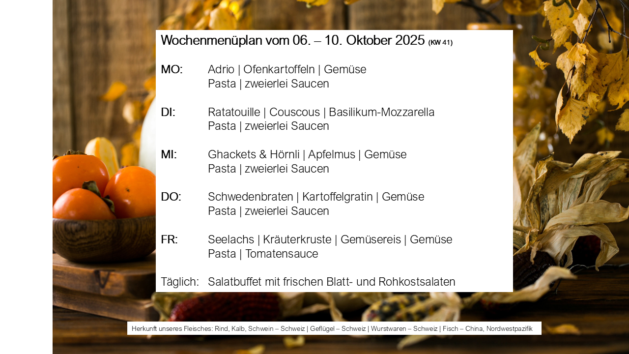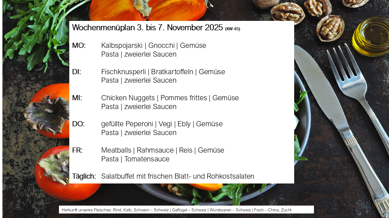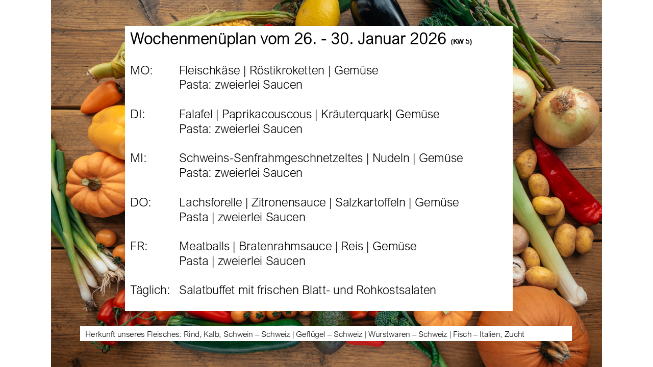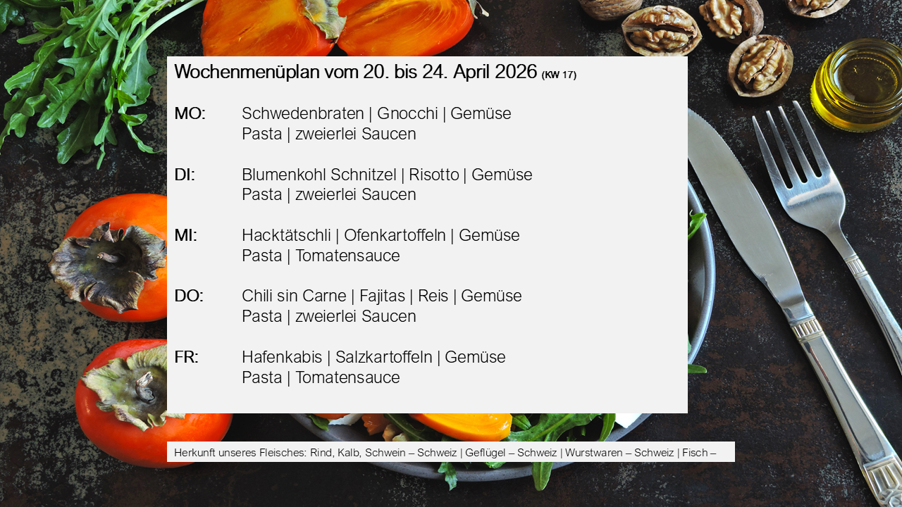 Das dreiköpfige Küchenteam sorgt für genussvolle und ausgewogene Speisen und legt dabei Wert auf eine frische Zubereitung und regionale Produkte. Zusätzlich zum Tagesmenü gibt es eine vegetarische Option, verschiedene Salate vom Buffet sowie ein Pastabuffet mit hausgemachten Saucen.