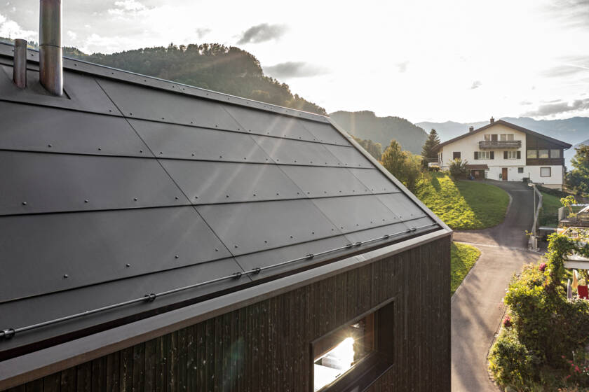 Das dreigeschossige Mehrfamilienhaus am Rande der Gemeinde Balzers ziert ein dunkles Holzkleid. Die drei einheitlich gehaltenen Fensterfronten verleihen dem Baukörper von aussen eine klare Struktur. Die Südseite des Daches wurde komplett mit Sunskin Roof Indach PV-Modulen bedeckt. Für die Architekten Siegbert Kranz Architektur AG war der gestalterische Hintergrund zentral, so entschieden sie sich auf der Nordseite für eine Dacheindeckung mit grossformatigen Integral Plan Faserzementplatten. Entstanden ist ein eleganter und ausdrucksstarker Gesamteindruck.