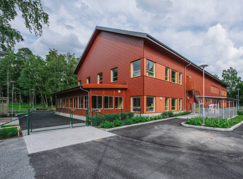 Den här svenska förskolan är ett utmärkt exempel på Swisspearl-skivornas mångsidighet. Byggnadens höjning mot ingången för allmänheten har en lätt stålstruktur klädd med perforerade vita Swisspearl-skivor som monterats vertikalt och har generösa öppningar till de övre balkongerna med utsikt över trädgårdens lekplats, samtidigt som byggnadens huvuddel är klädd med vita, ljus- och mörkgrå Swisspearl-skivor i distinkta vertikala band. Smaragdgröna fönsterkarmar lyser upp färgpaletten, som har en glad färgton som passar förskolan.