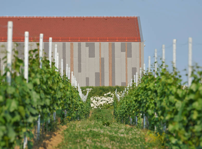 Nova stavba se prav tako odziva na širše okolje in se nanaša na vzorec pokončnih opornikov, ki podpirajo trte. To se subtilno odraža v igri nežnih vertikalnih pasov fasadnih plošč Swisspearl v odtenkih rjave in bež vzdolž dolge horizontalne fasade.