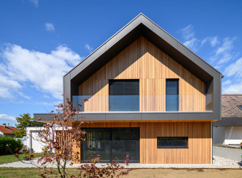 Na nagnjeni parceli, znotraj vaške zazidave, je biro zasnoval preprost podolgovat volumen, ki pod enotno streho združuje vse potrebne prostore, ki na skromni površini omogočajo kvalitetno bivanje petčlanske družine.Hiša je preprosta v tlorisu: prostori v pritličju – poleg dnevne sobe še predsoba in delovna soba – so organizirani okoli centralnega jedra s stopniščem, sanitarijami in kuhinjo. V nadstropju se jedro ponovi, okoli njega pa so nanizani spalnica in tri otroške sobe.