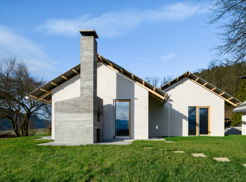 V Mlačevem stoji hiša, topla in domačna na prvi pogled, v svojem bistvu pa racionalna in tehnološka. 3biro jo je zasnoval v proporcih, prilagojenih leseni nosilni konstrukciji, in oblekel v cementne plošče, ki jo ovijajo na najbolj obremenjenih mestih.